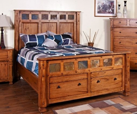 Sedona Eastern King Bed with Storage. Distressed mindi solid and veneer. Hideaway drawer in chest. Full ext. ball bearing drawer glides. Genuine slate accents. Construction: Wood. Color: Rustic Oak. Style: Contemporary. Series: Sedona. Size: Eastern King. Type: Panel.