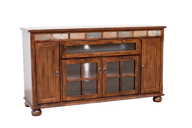 | This santa fe collection counter height television console is taller to be a comparable height when wall mounting a television for example. the console features six full extension ball bearing slide cd drawers an adjustable interior shelf slate pieces waterfall glass doors and dimpled knobs. the center door is also 3-way exchangeable between the glass (pictured) and speaker grid or a wooden panel (not pictured). Founded in 1980 sunny designs inc. has pursued diligently to provide our customers the very best value without compromising exceptional quality and service. continuous efforts to develop new products to create more value and to meet customer needs make sunny designs a leading manufacturer/distributor in the home furnishing industry. Price: 1319.50 ![]() |