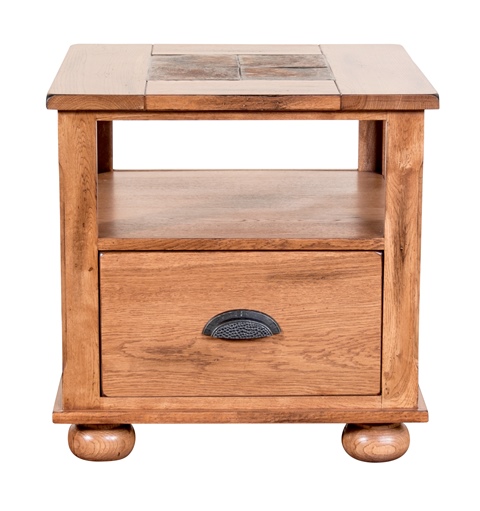 Composition: Wood Veneers and Solids. Wood and Finish: Distressed oak with rustic finish. Style: Casual. Handles and Hardware: Dented rustic knobs. Case Detail: Legs are carefully crafted with solid oak. Tapered and fluted to perfection that adds a unique style as well as lasting functionality. Table edges feature oak veneer. Drawer / Shelf Construction: Drawers are constructed with dovetail joints and full extension ball bearings allow easier access to storage. Shelves are crafted with oak veneer tops. 1 Drawer. 1 Shelf. Dimensions: 24W x 24D x 24H.